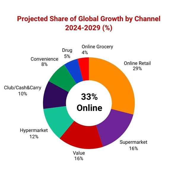 • Channel Growth Forecasts: Online retail set to drive 33% of global growth.